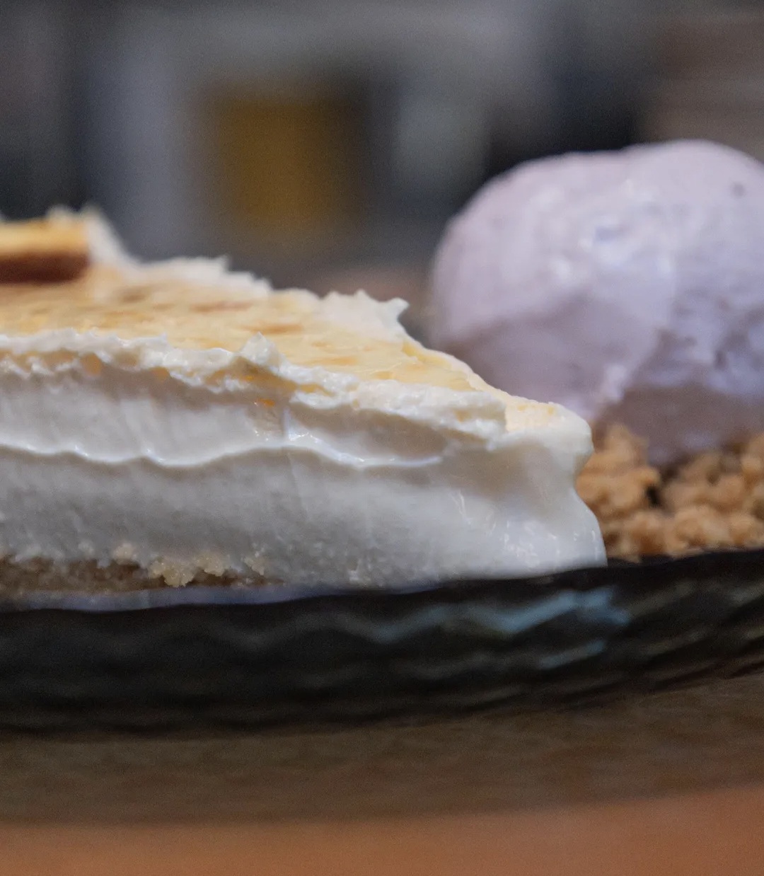 La tarta de queso de Vero al horno, muy cremosa y ligera, acompañada de una bola de helado artesanal de @bicodexeado. " Posiblemente la mejor Tarta de Queso de todo el norte de España.."