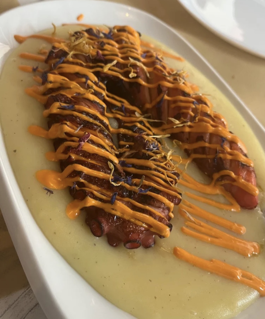 Pata de pulpo de Dakhla cocido en su propio jugo a baja temperatura, marcado a la parrilla sobre crema suave de patata y nuestro aliño de emulsión del jugo de su cocción con "allada". (350 gr.)