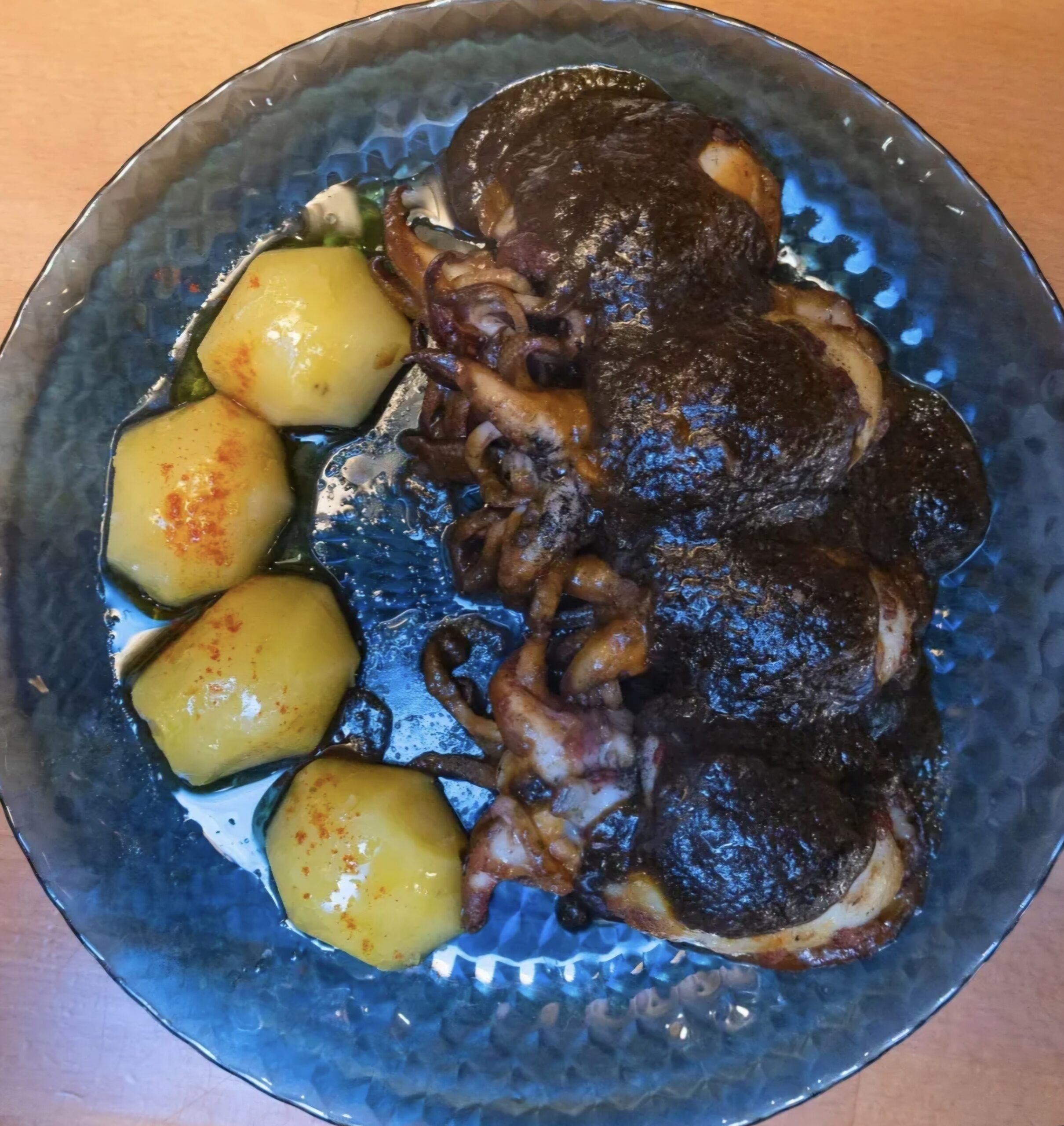 Chocos frescos de la Ría de Arousa, distribuidos por @pescadosjesy, salteados en su tinta con salsa marinera y cachelos para acompañar. (300 gr.)